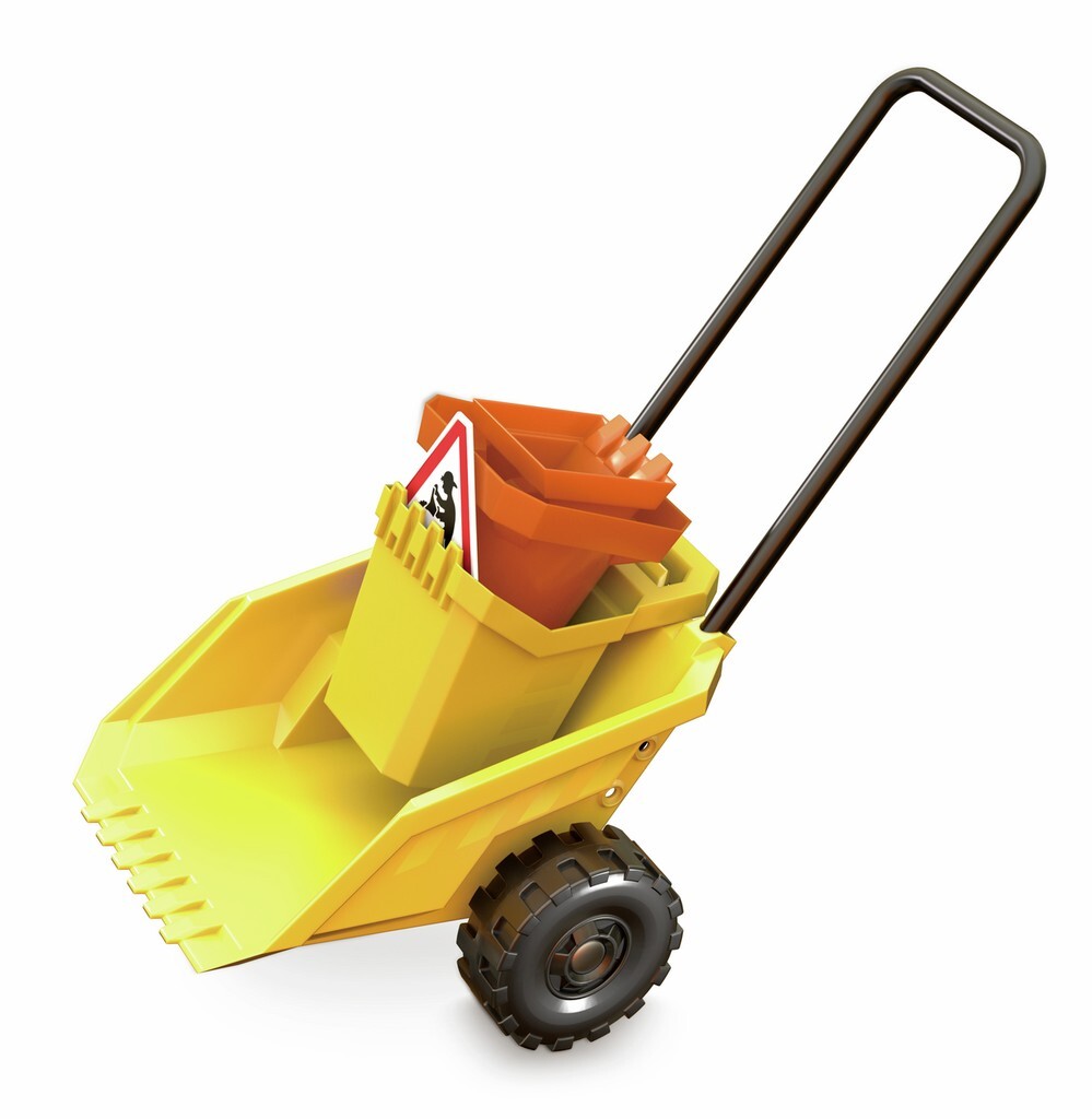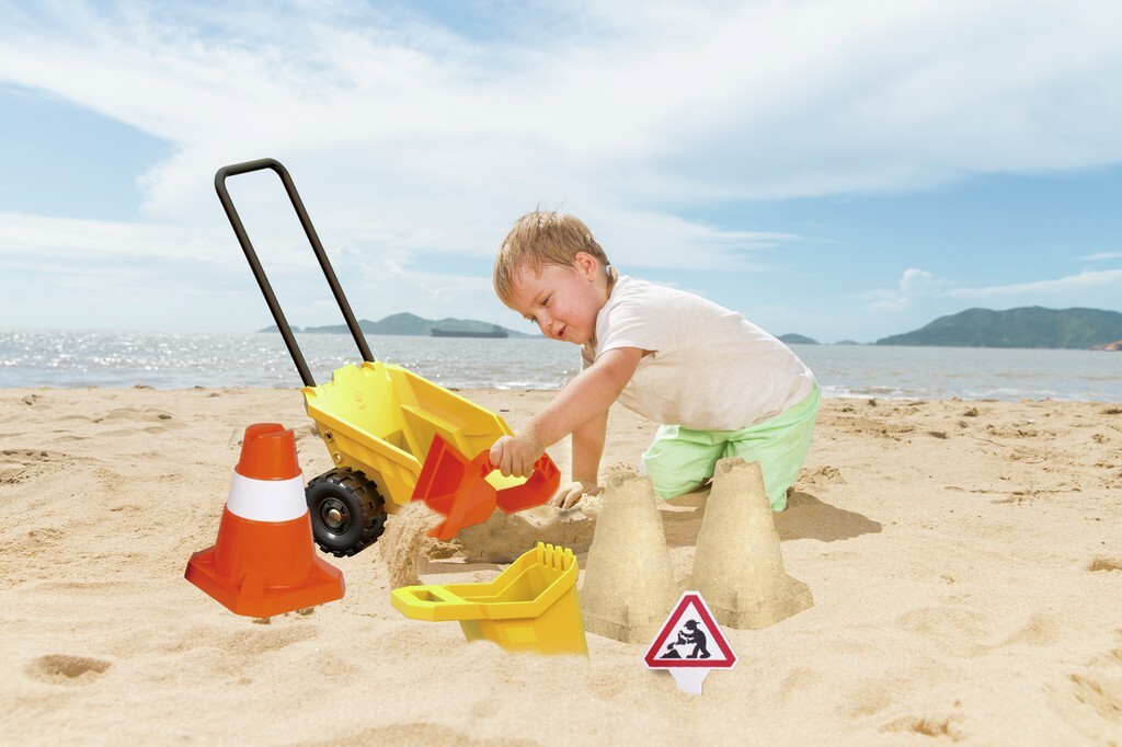 Hochwertige Sandspielzeuge mit Kipper, Baggerschaufel für kleine Kinderhände, Baueimer mit Griff zum Tragen großer Sand- oder Wassermengen, Baukegel und Baustellenschild zum Abstecken der Baustelle. - Stapelbar für leichteres Verstauen - Anzahl Teile: 5 - Gewi...
