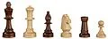 Design: Staunton, Königshöhe 76 mm, Erle, natur und nussbaum gebeizt, gewichtet, Filzsockel, im Polybeutel.