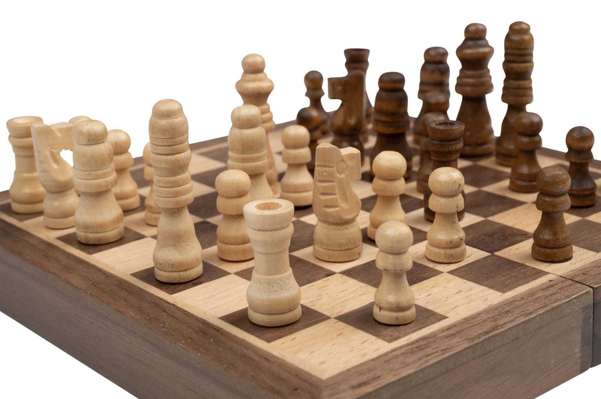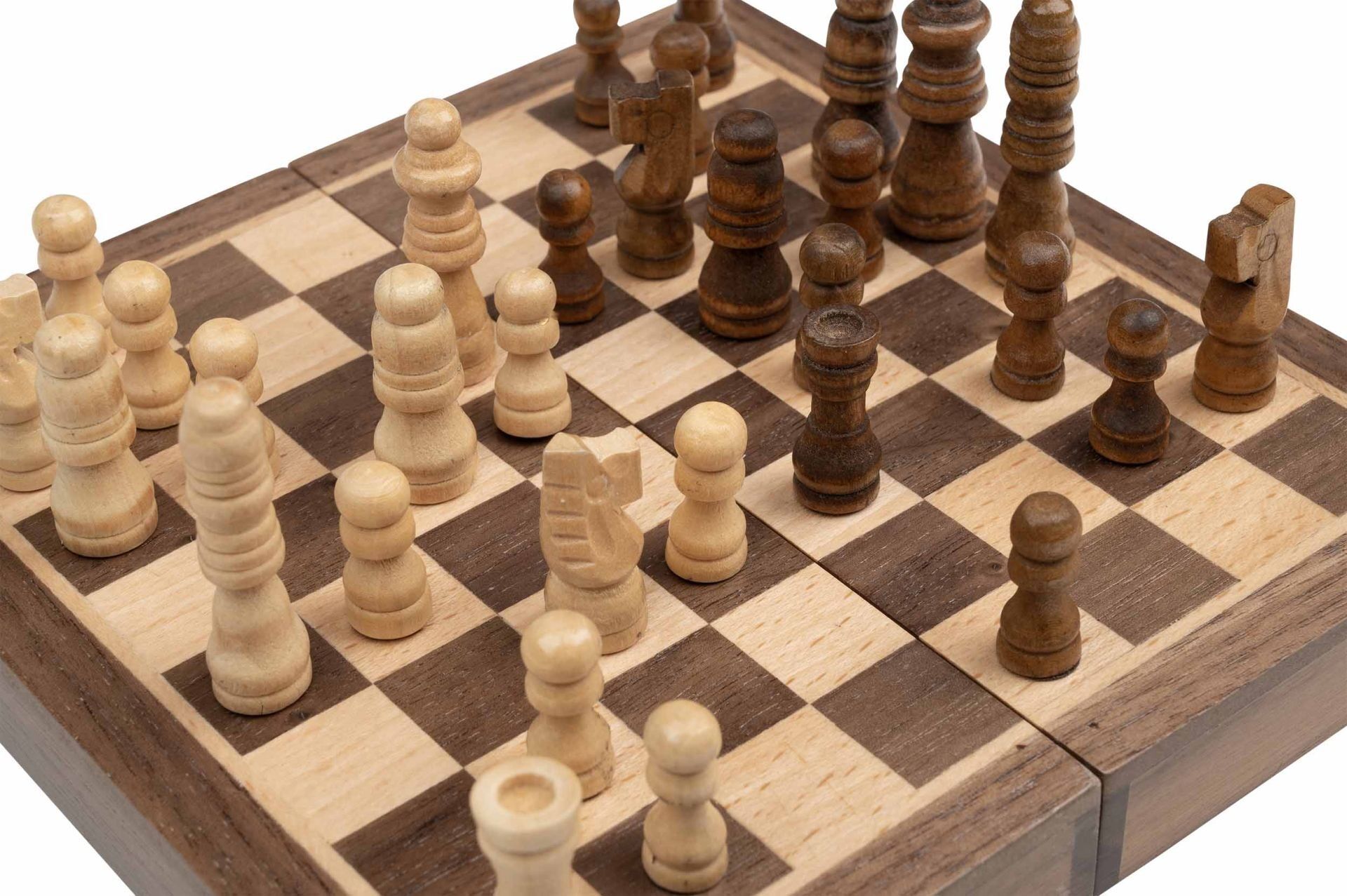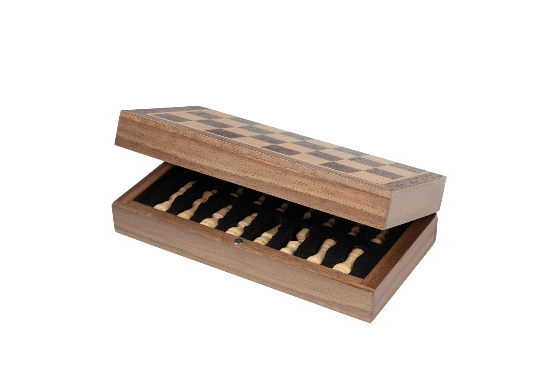 Schach ist ein spannendes Strategiespiel für zwei Personen. Inhalt: 1 Kassette, 16 dunkle Schachfiguren, 16 helle Schachfiguren Maße Spiel: 150 x 75 x 37 mm Maße Spiel offen: 150 x 150 x 19 mm Maße Verpackung: 160 x 85 x 65 mm Feldgröße: 16 mm Königshöhe: 39 m...