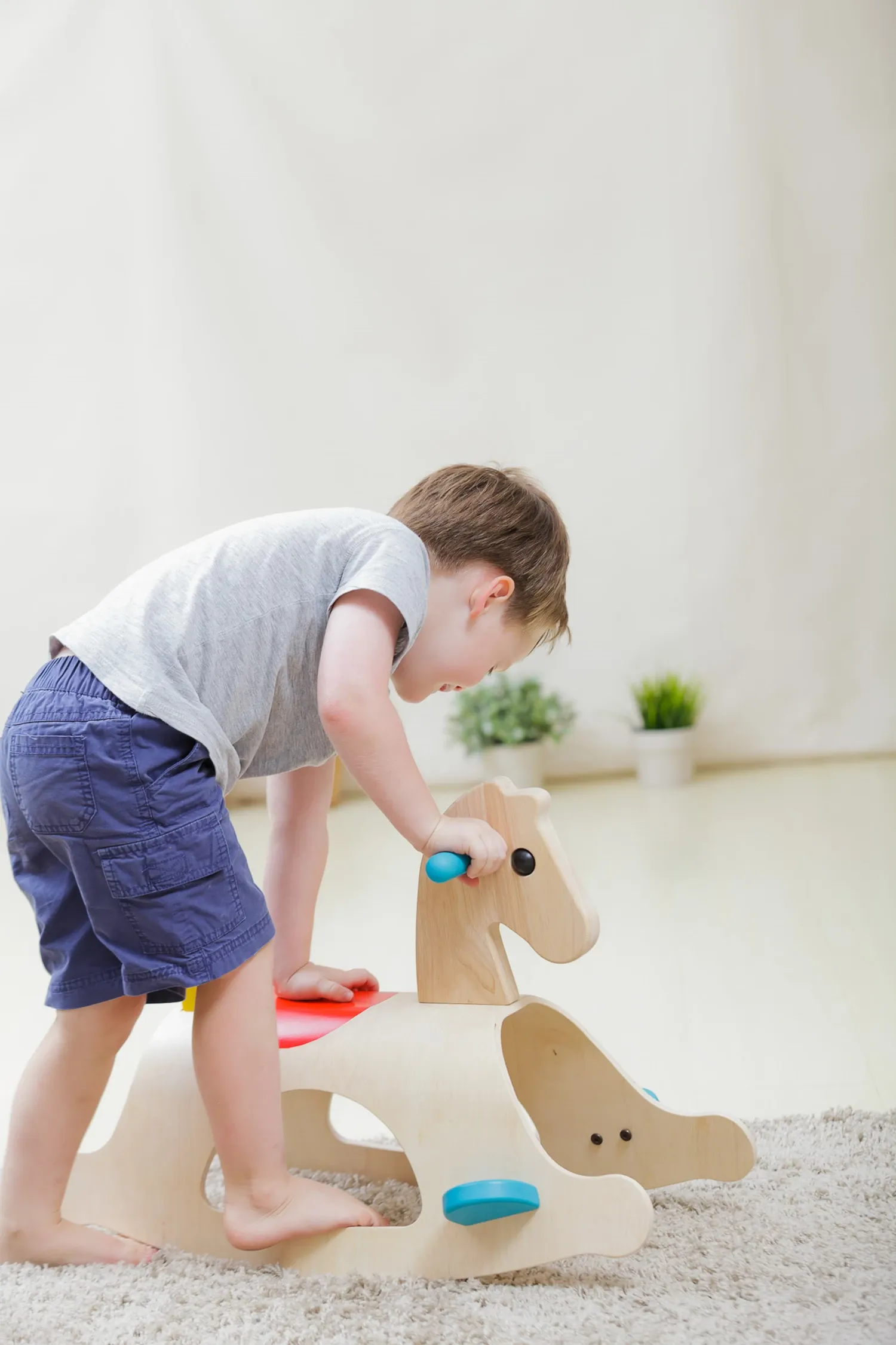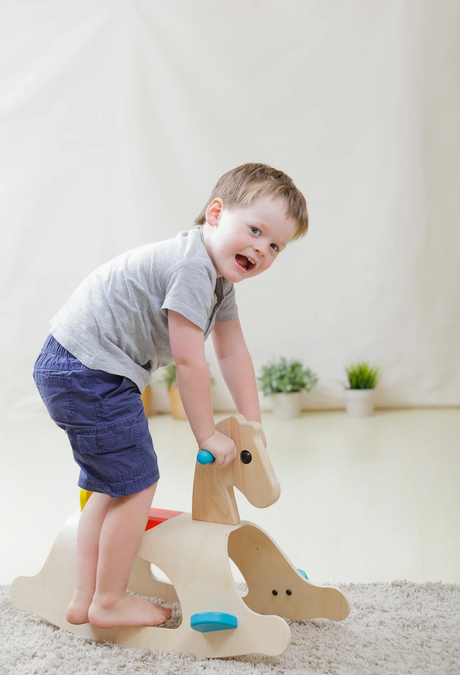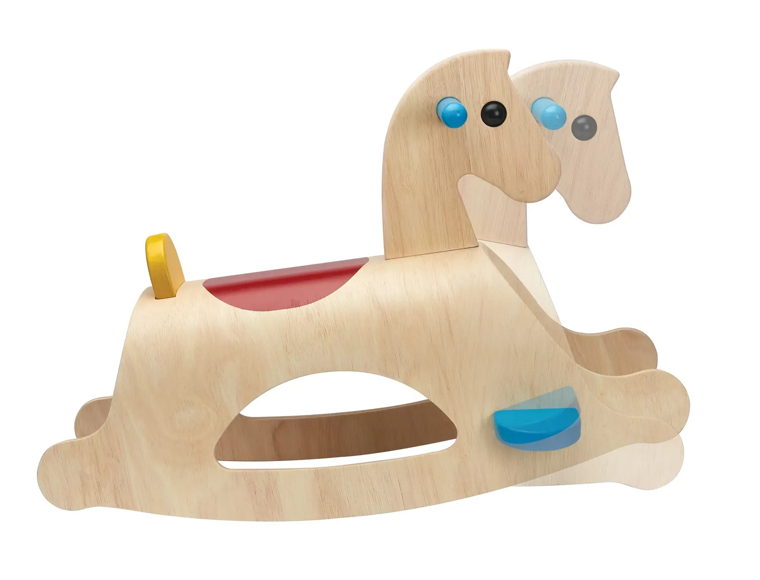Palomino, das klassische Schaukelpferd aus naturfarbenem Holz mit sanften, abgerundeten Formen und farbigen Details. Die stabilen Handgriffe und die beiden Fussstützen geben sicheren Halt und sorgen dafür, dass die kleine Reiterin, der kleine Reiter auch bei e...