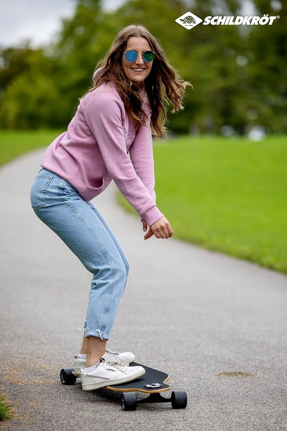 Longboard (104 cm) aus 9-fach verleimten Ahorn im beliebten Freeride-Shape. Abgesenktes Deck durch Drop-Through-Achsenaufhängung (Achsaufhängung auf der Oberseite des Boards). Trendige schwarz pulverbeschichtete 7" Aluminium-Trucks / Achsen mit Logoprint, farb...