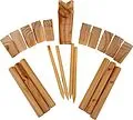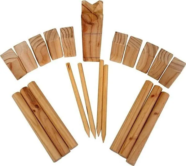 Das beliebte Garten-Spiel aus Skandinavien. Bestehend aus 1 König 30x7x7cm, 10 Kubbs 15x5x5cm, 6 Wurfhölzer 30x3,5x3,5cm, 4 Eckpflöcke, alles aus FSC zertifiziertem Pinienholz mit Stofftasche Inkl. Spielanleitung