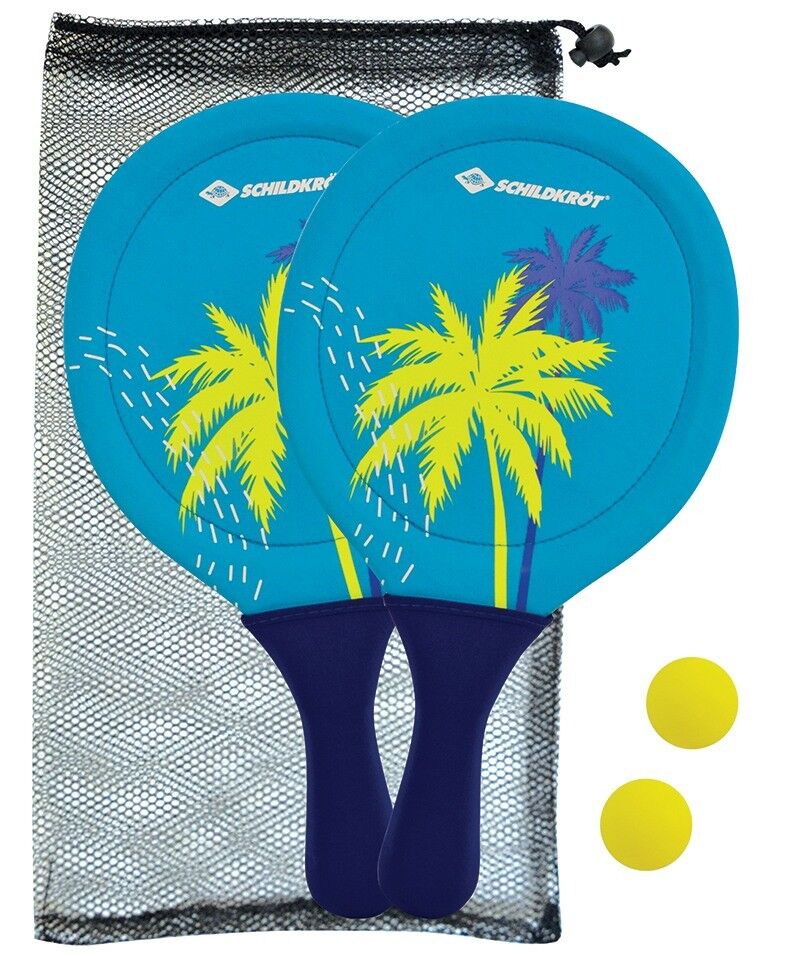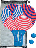 Neopren Beachball Set bestehend aus 2 Schlägern mit Print. Die Schläger sind mit elastischem Neopren bespannt für maximalen Katapult-Effekt (Länge 40 cm, Breite 22,5 cm, Stärke 0,8 cm), 2 Bälle aus Gummi (40mm), in wiederverschließbarer Netztasche mit Kordelzu...