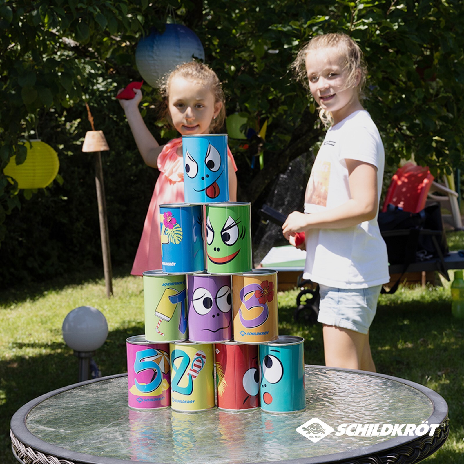 Das Schildkröt Dosenwurfspiel besteht aus 10 Metalldosen (6,5 x 10cm) mit verschiedenen, farbenfrohen Smiley Designs, die Kindern ein Lächeln ins Gesicht zaubern. Alle Spieler werfen nacheinander und haben 3 Versuche die Dosen abzuräumen. Geworfen wird mit 3 r...