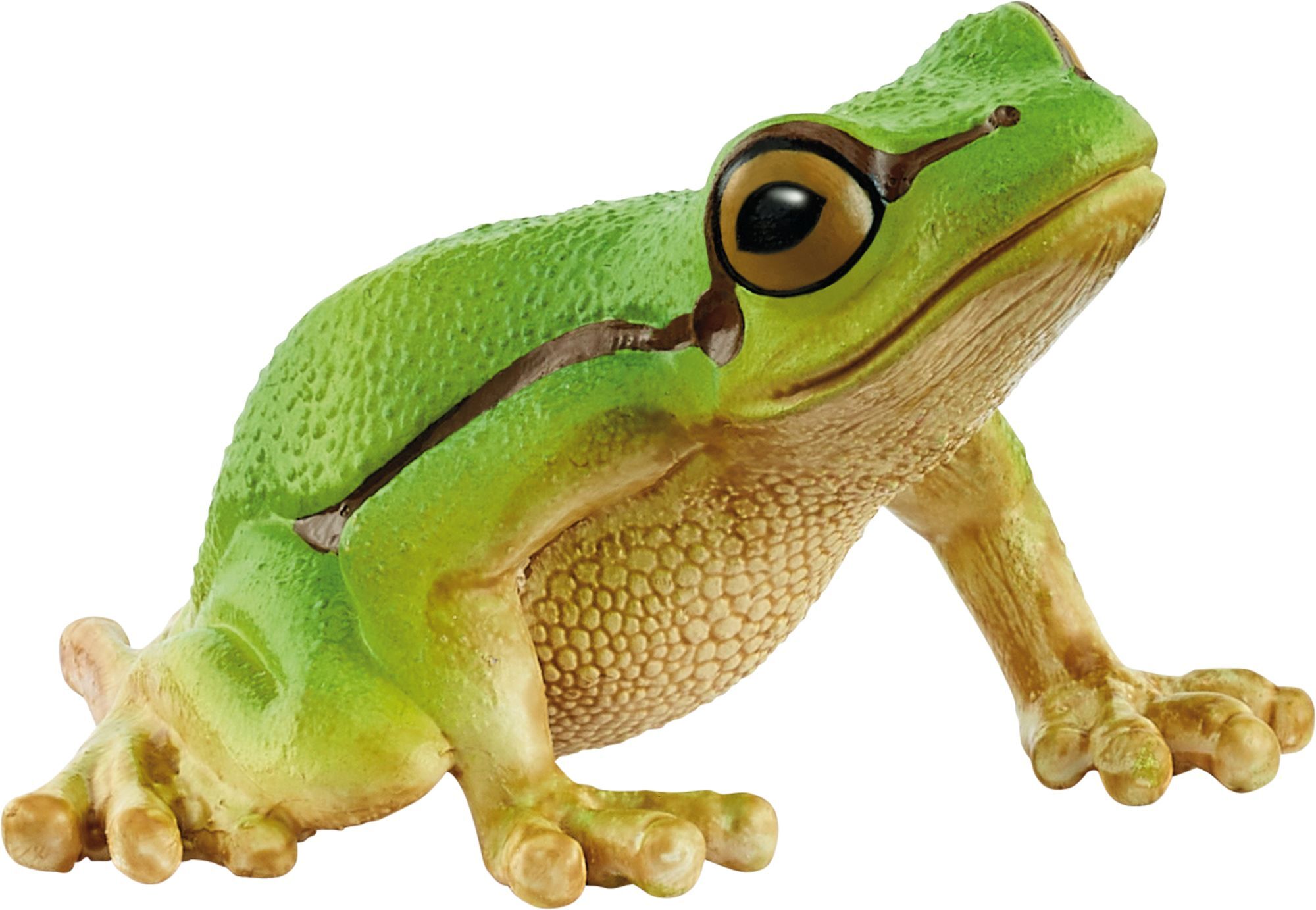 Der Europäische Laubfrosch wird nur drei bis vier Zentimeter groß. Obwohl er so klein ist, ist er nicht leicht zu übersehen. Er ist nämlich leuchtend grün. Nur der Bauch ist hellbraun bis cremefarben gefärbt. Von der flachen, breiten Schnauze am Auge vorbei üb...