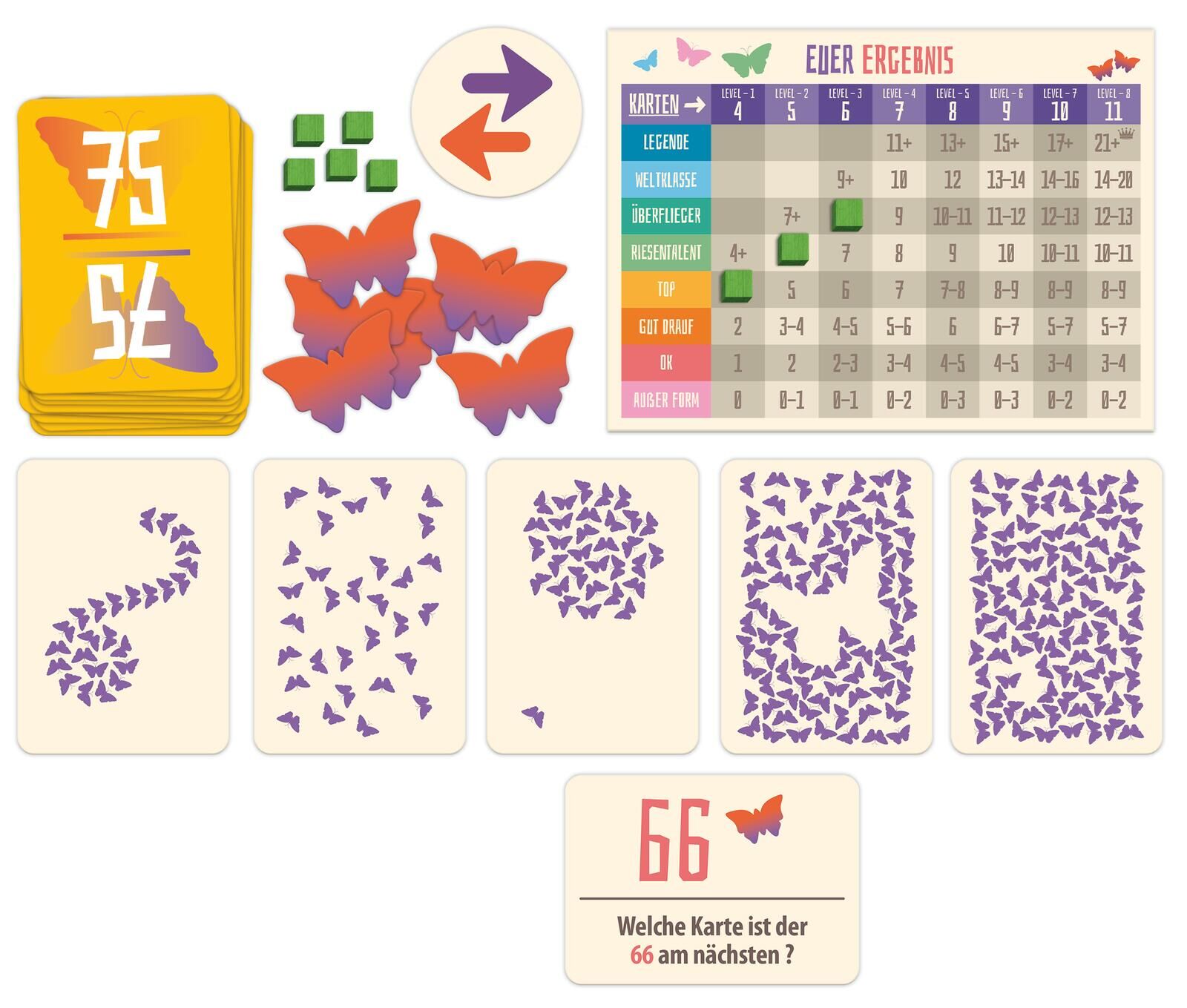 Schmetterlinge schätzen Unzählige Schmetterlinge und eine gemeinsame Herausforderung: In vier spannenden Phasen müssen die Karten in die richtige Reihenfolge gelegt werden. Im Team wird diskutiert, geraten und entschieden. Zusätzlich sorgen knifflige Fragen fü...