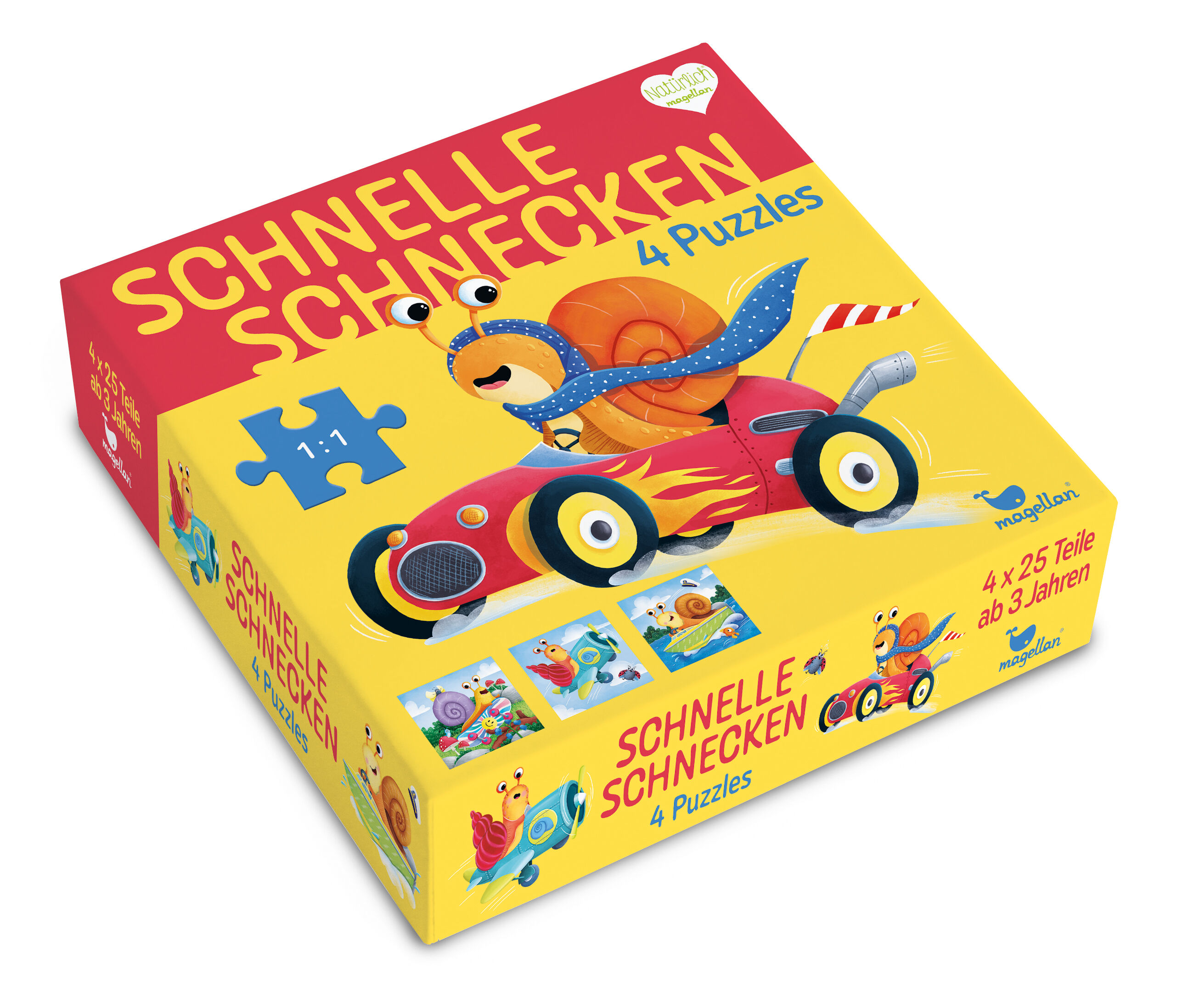 Puzzles mit Tier-Motiven für Kinder ab 3 Jahren Ob mit dem Skateboard, Flugzeug, Rennauto oder auf dem Schnellboot mit Vollgas sausen die vier superschnellen Schnecken um die Wette! Auf spielerische Weise fördern die vier 25-Teile-Puzzles mit ihren hübschen M...