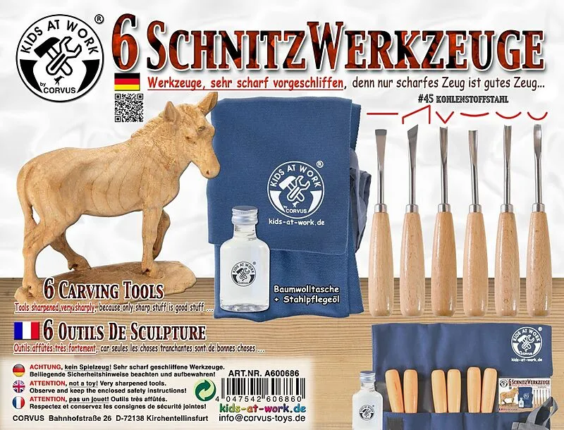 Corvus A600686 Schnitzwerkzeuge 6-tlg mit Baumwolltasche und Stahlpflegeöl.