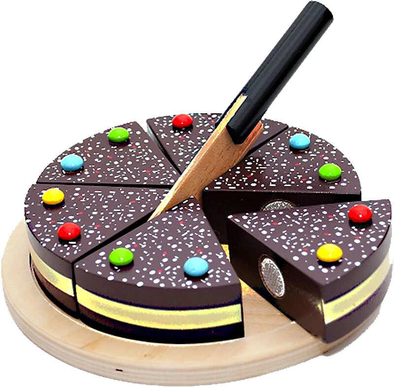 Schokoladen-Kuchen aus Holz zum schneiden. Inhalt: 6 Kuchen-Ecken mit Teller und Messer. Ab 3 Jahren.