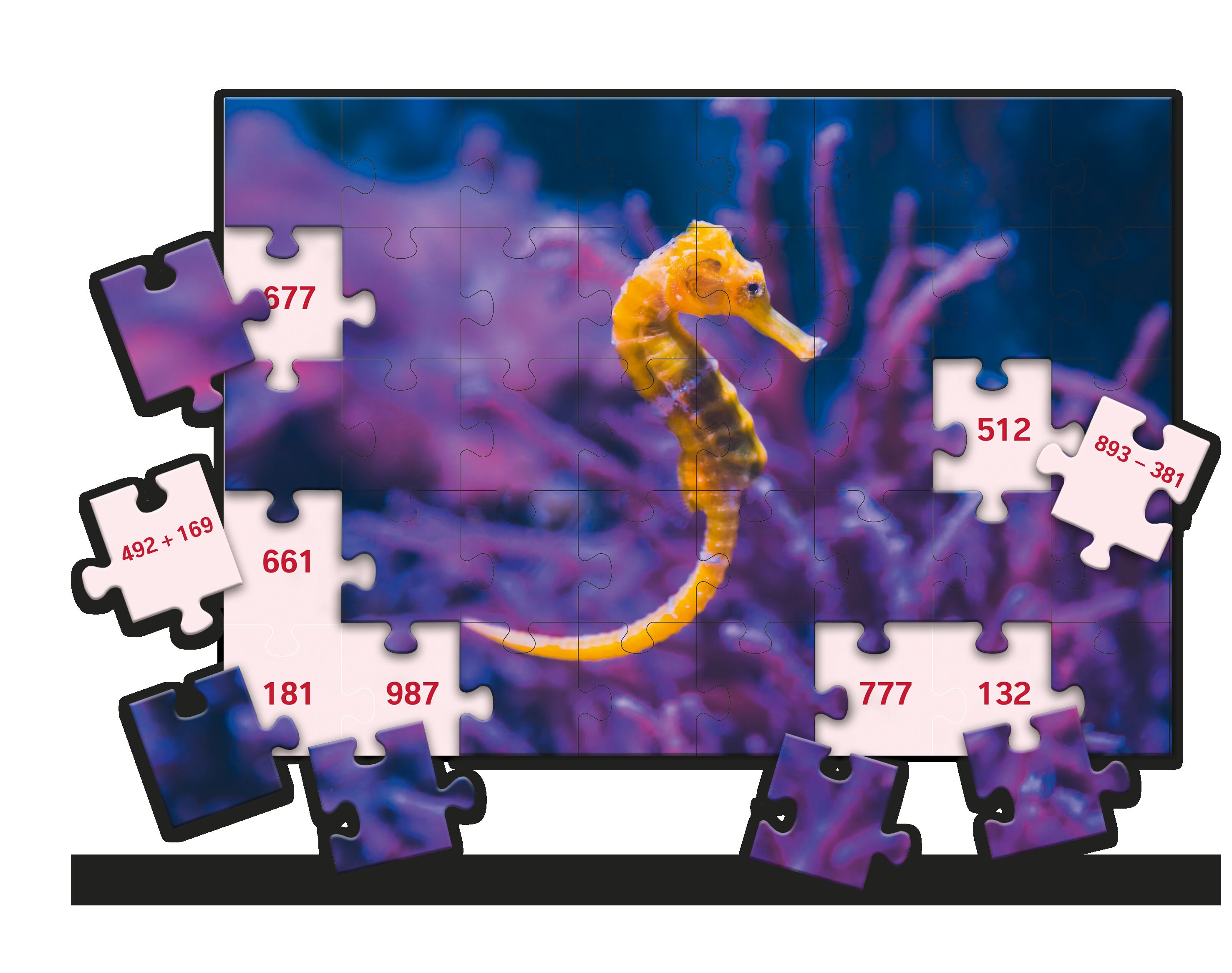 Hier wird gerechnet! - Zum Zusammensetzen der Puzzles werden die Rechenaufgaben auf der Rückseite der Puzzleteile gelöst. Die Kinder legen die Teile auf den richtigen Feldern der Grundtafel ab, Bildseite nach oben. Dadurch ergibt sich eine unmittelbare Selbst...