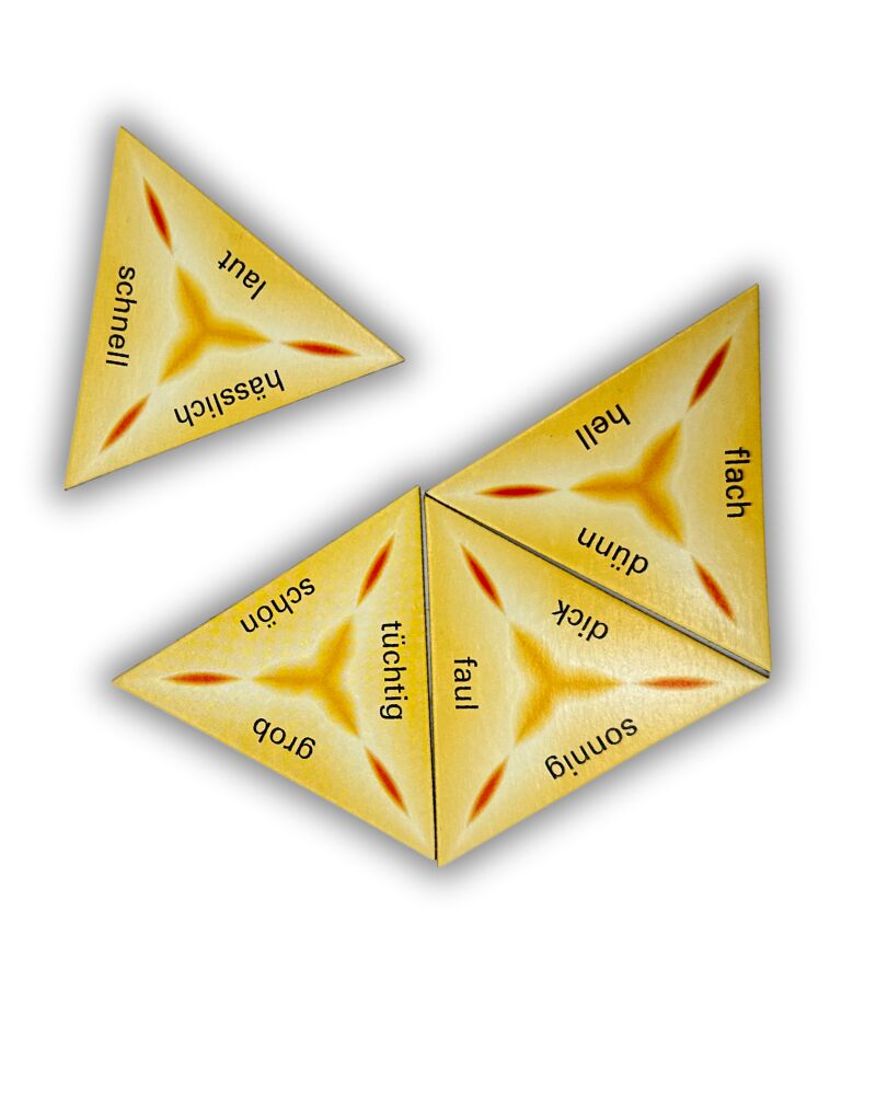 Die SCHUBITRIX -Spiele erweitern den Wortschatz und üben spielerisch und mit Selbstkontrolle das richtige Anwenden von Adjektiven, Verben und Nomen. Wenn die dreieckigen Spielkarten so zusammenfügt werden, dass die beiden Wörter der aneinander liegenden Seite...