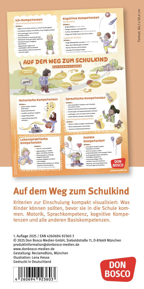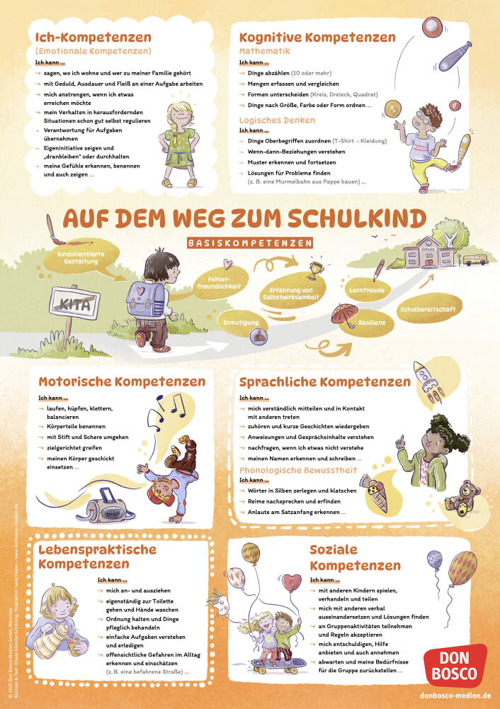 Kriterien zur Einschulung: Feinmotorik, Grobmotorik, Sprachkompetenz und alle anderen Basiskompetenzen kompakt visualisiert. Poster Beurteilung der Schulfähigkeit: Kompetenzen übersichtlich visualisiert auf einem Poster Wenn für Kindergartenkinder der Übergang...