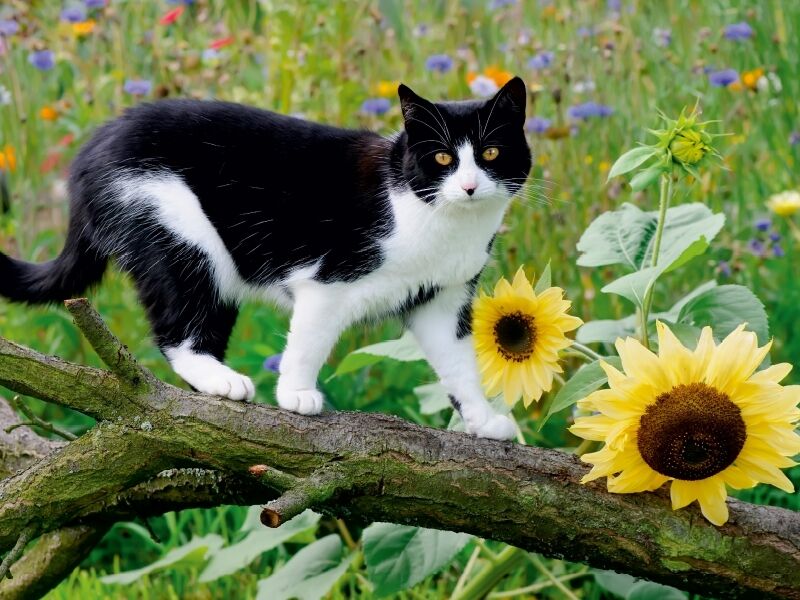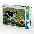 Schwarz-weiße Katze mit Sonnenblumen (Puzzle)