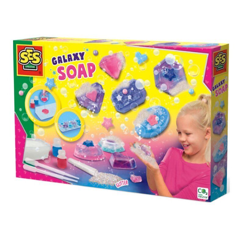 Galaxie Seife selber herstellen! Dieses Set Seifen giessen Galaxy von SES Creative beschert ein ganz besonderes Bastel-Erlebnis für alle Sinne, denn hier kann man wunderbar duftende Seifen selbst kreieren. Zunächst die Seife in der Mikrowelle schmelzen, mit de...