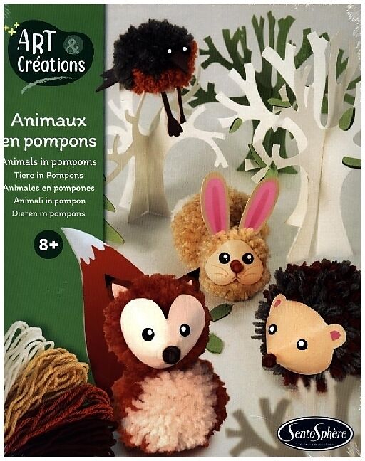 Kreative Waldtiere gestalten mit Pompons und dekorativen Elementen. Inhalt: 5x16g Wollknäuel, 1 Plastik-Nadel, 2 Set Pompon-Kreisen in zwei Grössen, dekorative Kartonelemente um die Pompons zu personalisieren und eine Anleitung.
