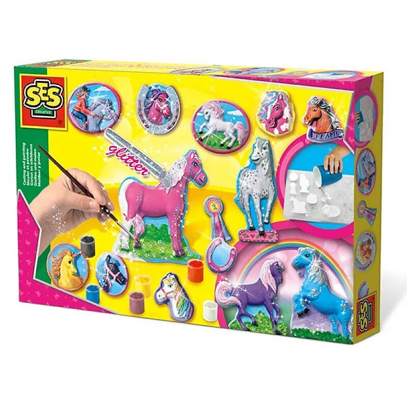 Pferde giessen und anmalen mit SES. Mit diesem Set kann man tolle Medaillons mit Pferden aus Gips herstellen: die Gipsmasse anrühren, in die Form giessen, austrocknen lassen (ca. 24 Std.) und schliesslich mit Farben anmalen und mit Glitzer verzieren. Inhalt: G...