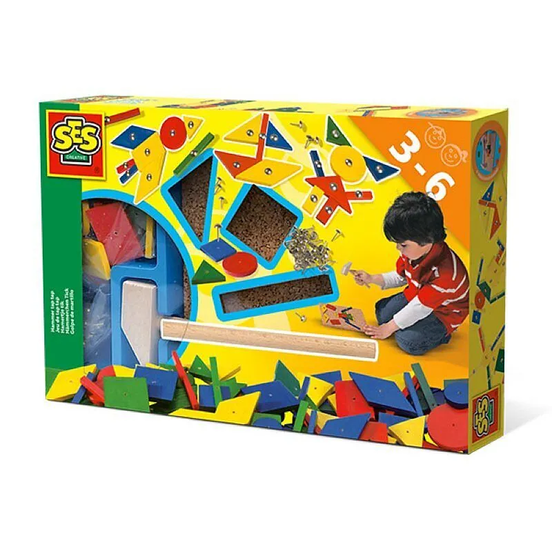 Hämmerchen Tick - Klassik von SES. Das klassische Hammer und Nagelspiel für die ganz Kleinen: 32 verschiedene geometrische Formen müssen in die Korkplatte gehämmert werden. Dabei entstehen die tollsten Figuren und Formen in den verschiedensten Farbkombinatione...