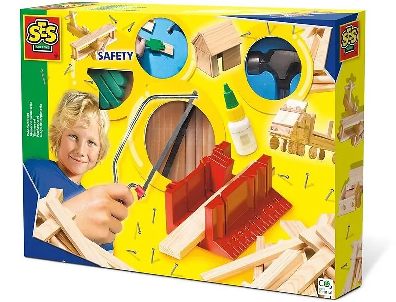 Werkzeugset von SES. Für echte Handwerker: Hammer, Nägel, Holz, Leim - und los gehts. Mit diesem Set kannst Du Dich als echter Handwerker probieren. Inhalt: Echter Minihammer, vorgefertigte Holzteile, Nägel, Holzleim, Gummihand zum Schutz der eigenen Finger, G...