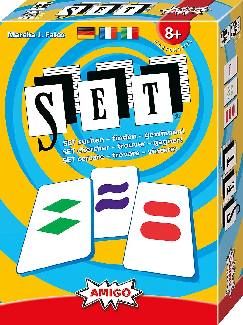 Alle spielen gleichzeitig. Wer findet als Erster ein SET in der Kartenauslage auf dem Tisch? Dazu müssen die Symbole auf drei Karten die richtige Farbe, Form, Füllung und Anzahl haben.