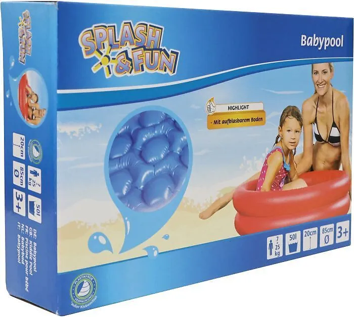 Splash & Fun Pool uni mit aufblassbaren Boden, # 85 cm Splash und Fun Baby-Pool uni mit aufblasbaren Boden. Aus hochwertigem und strapazierfähigem Material mit einer Materialdicke von 0,18mm. Mit zwei aufblasbaren Wulsten ausgestattet. Füllgewicht 50 Liter. Du...