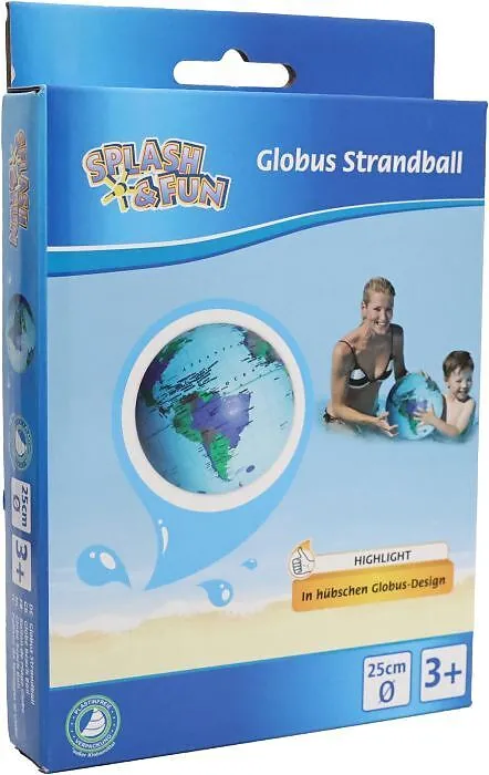 Splash und Fun Strandball im Globus Design. Durchmesser aufgeblasen 25cm. Aus PVC mit einer Materialstärke 0,18mm. Für Kinder ab 18 Monaten.