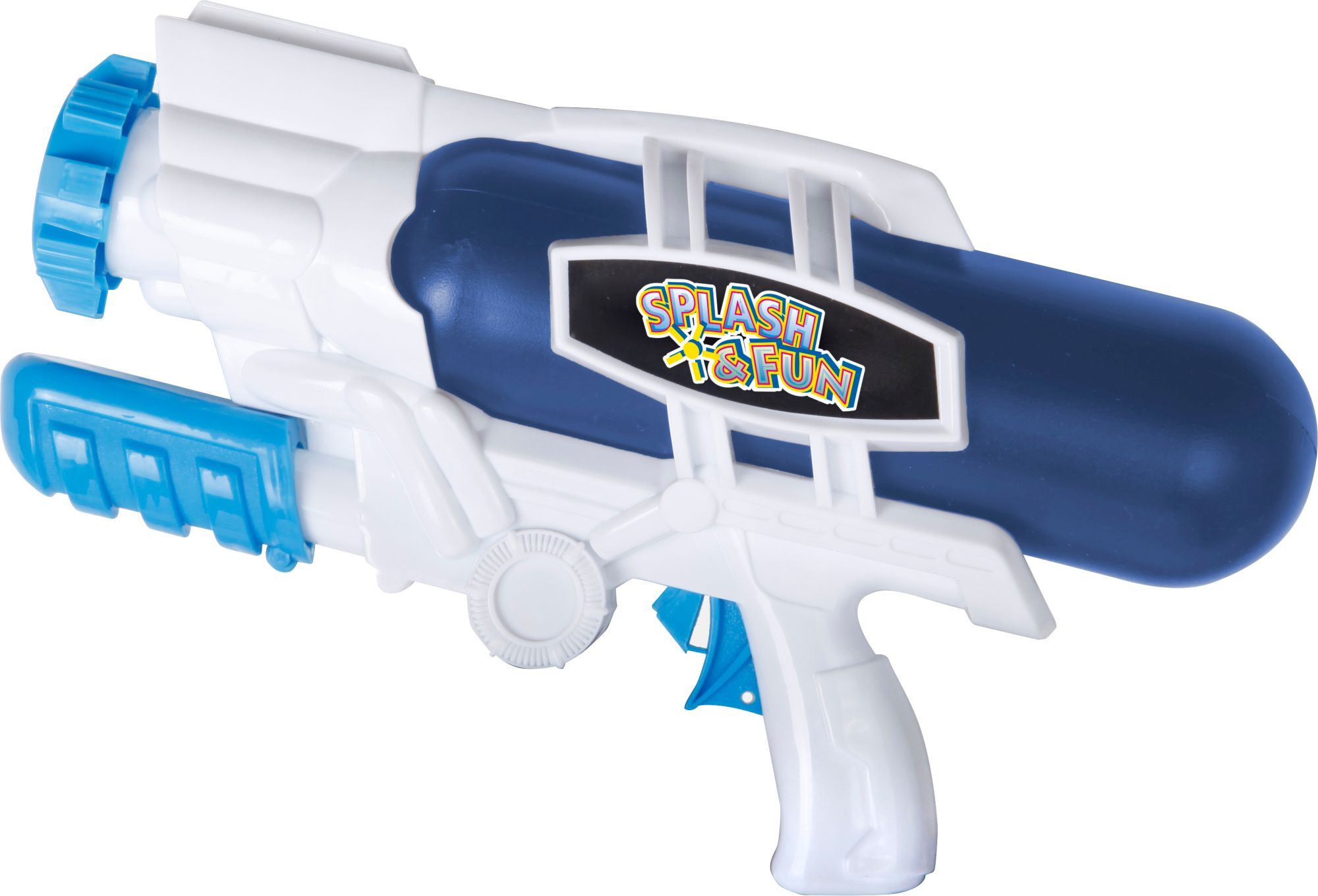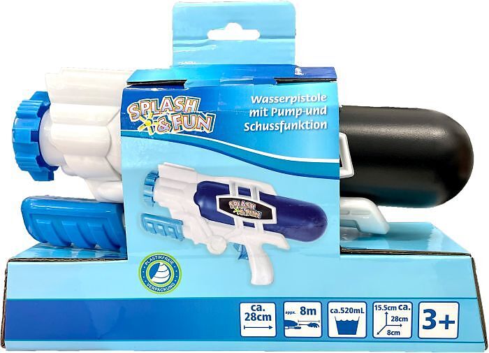 Splash und Fun Wasserpistole mit Pump- und Schussfunktion, Länge ca. 28 cm. Tankinhalt ca. 520 ml. Schussweite ca. 7 bis 8 Meter. Maße ca. 28x8x15,5 cm. Für Kinder ab 3 Jahren.