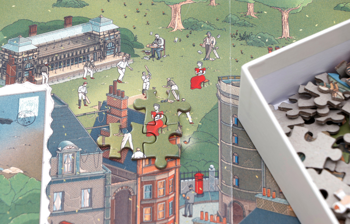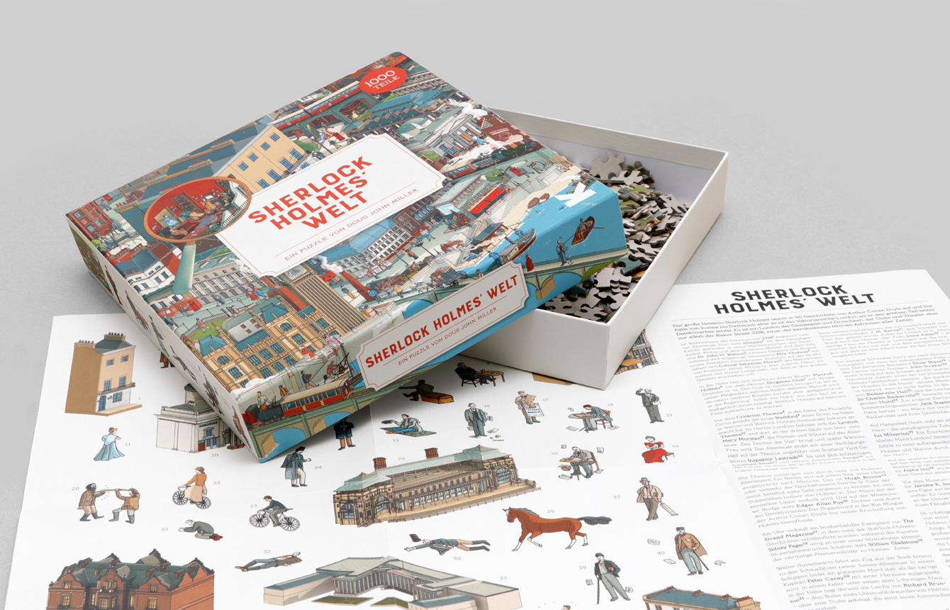 -1000-Teile-Puzzle zeigt ein Panorama von Sherlocks London -Entdecken Sie Figuren aus Sherlocks berühmtesten Fällen und historische Personen -Enthält A2-Poster mit unterhaltsamen Sherlock-Fakten Setzen Sie Sherlocks Welt zusammen! Nehmen Sie Ihre Deerstalker-M...