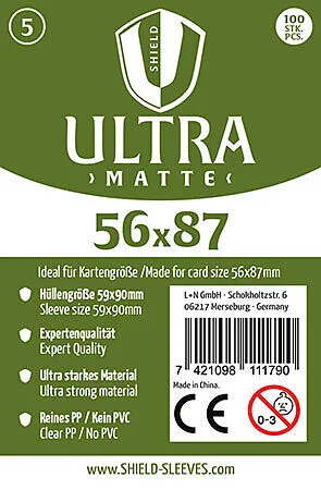 Hüllengröße: 59 x 90 mm für Kartengröße: 56 x 87 mm Dicke: 120m Diese Shield Schutzhüllen in Expertenqualität sind speziell für Spielkarten aus Brett- und Kartenspielen entworfen worden. In jeder Packung befinden sich 100 Kartenhüllen in den Maßen 59 x 90 mm (...