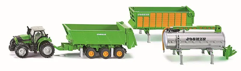 SIKU 1848 DEUTZ-FAHR mit Joskin Anhängerset Detaillierter DEUTZ Agrotron X720 Traktor mit Joskin-Cargo Anhängerset zum Spielen und Spaß haben - 5-teiliges Set: 1x Traktor, 1x 3-Achs-Fahrgestell, 1x Silagewagen, 1x Güllefass, 1x Universalstreueraufbau - Langanh...