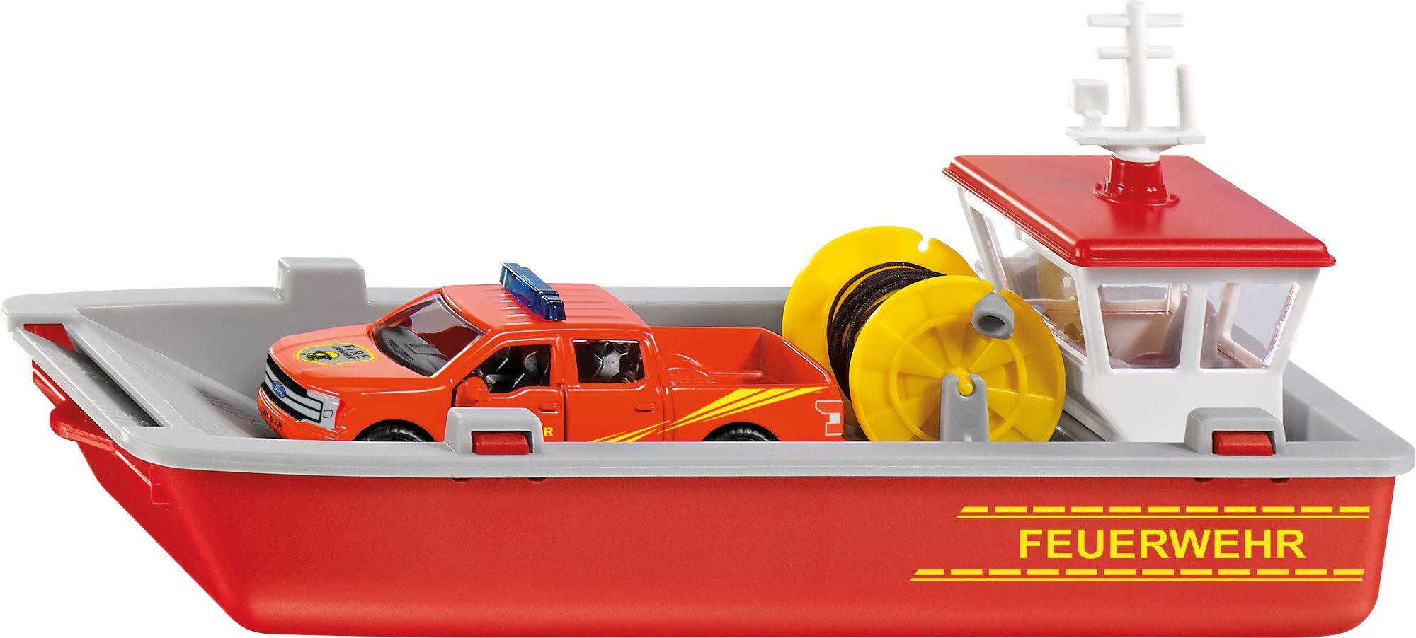 SIKU 2117 Feuerwehr Arbeitsboot Detailliertes Spielzeugmodell eines Feuerwehr-Arbeitsboots zum Spielen und Sammeln, Für kleine und große Feuerwehr-Fans - Robustes und stabiles Design, Drehbare Schlauchhaspel, Abrollbarer Schlauch, Klappbare Rampe, Pick-Up mit ...