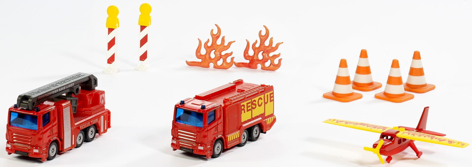 SIKU 6330 Geschenkset Feuerwehr Detailliertes Spielzeug-Set mit 1 Drei-Achs-LKW, 1 Löschfahrzeug, 1 Flugzeug und Zubehör für kleine und große Feuerwehr-Fans - Robustes und stabiles Design dank Metallkarosserie, LKW mit 360° drehbarer Rettungsbühne mit 3 Knickg...
