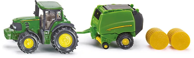 SIKU 1665 John Deere Traktor mit Ballenpresse Detailliertes Spielzeugmodell eines John Deere Traktor mit Ballenpresse und 2 passenden Ballen zum Spielen und Sammeln - Robustes und stabiles Design dank Metallkarosserie, Abkuppelbare und öffenbare Ballenpresse, ...
