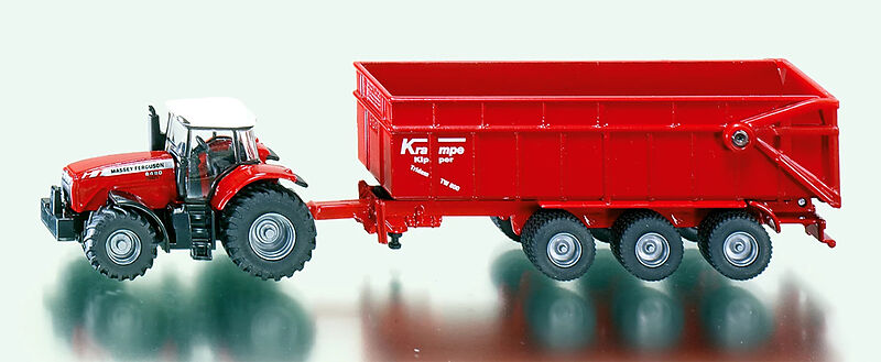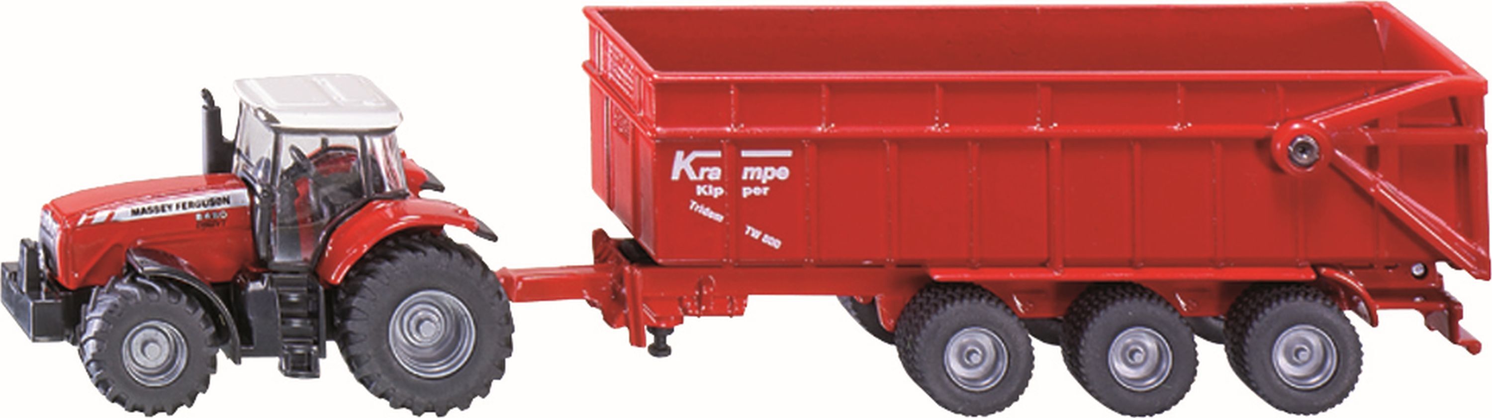 SIKU 1844 Massey Ferguson Traktor mit Anhänger Detaillierter Massey Ferguson Traktor mit Anhänger der Marke Krampe zum Spielen und Spaß haben - Robust und stabil dank Konstruktion aus Metall, Abnehmbares Verdeck, Kippbarer Anhänger, Frontgewicht und Anhängerku...
