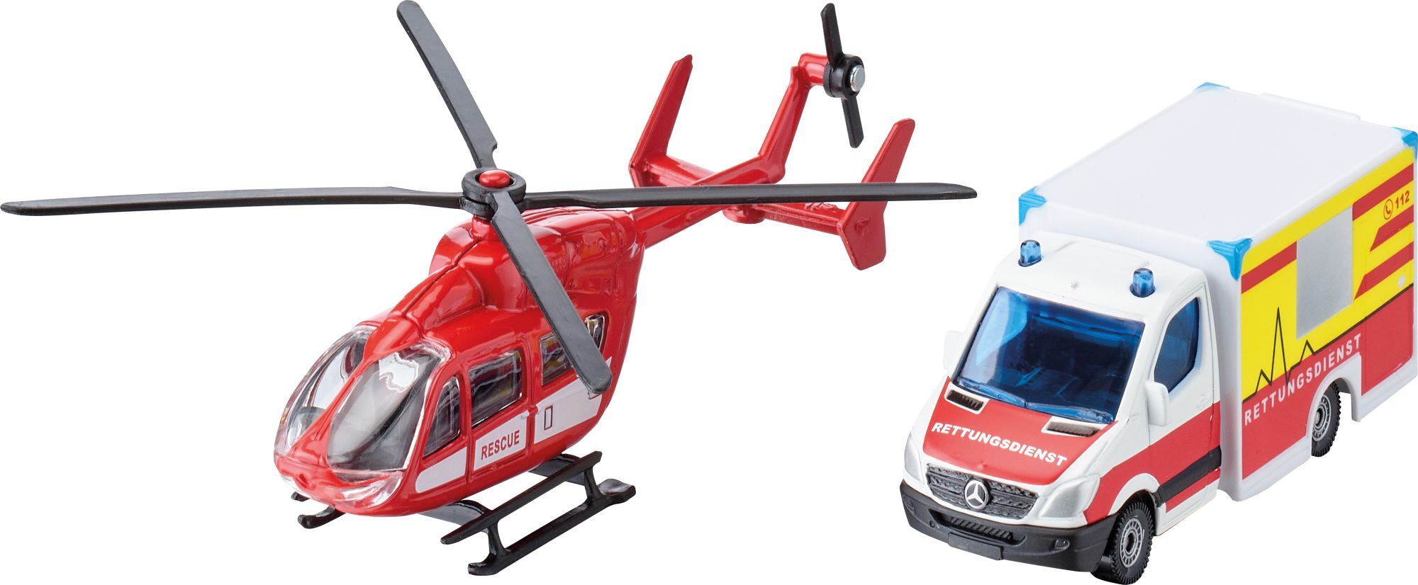 SIKU 1748 Mercedes-Benz Rettungswagen und Helikopter Dieses hochwertige Spielset bringt Spannung und Abenteuer ins Kinderzimmer! Mit dem detailgetreu gefertigten Mercedes-Benz Rettungswagen und dem Eurocopter EC 145 Helikopter können kleine Helden aufregende R...