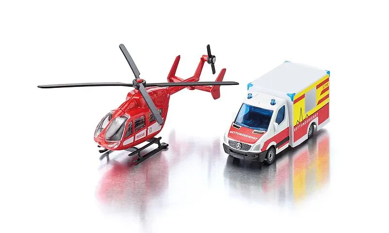 SIKU 1748 Mercedes-Benz Rettungswagen und Helikopter Dieses hochwertige Spielset bringt Spannung und Abenteuer ins Kinderzimmer! Mit dem detailgetreu gefertigten Mercedes-Benz Rettungswagen und dem Eurocopter EC 145 Helikopter können kleine Helden aufregende R...