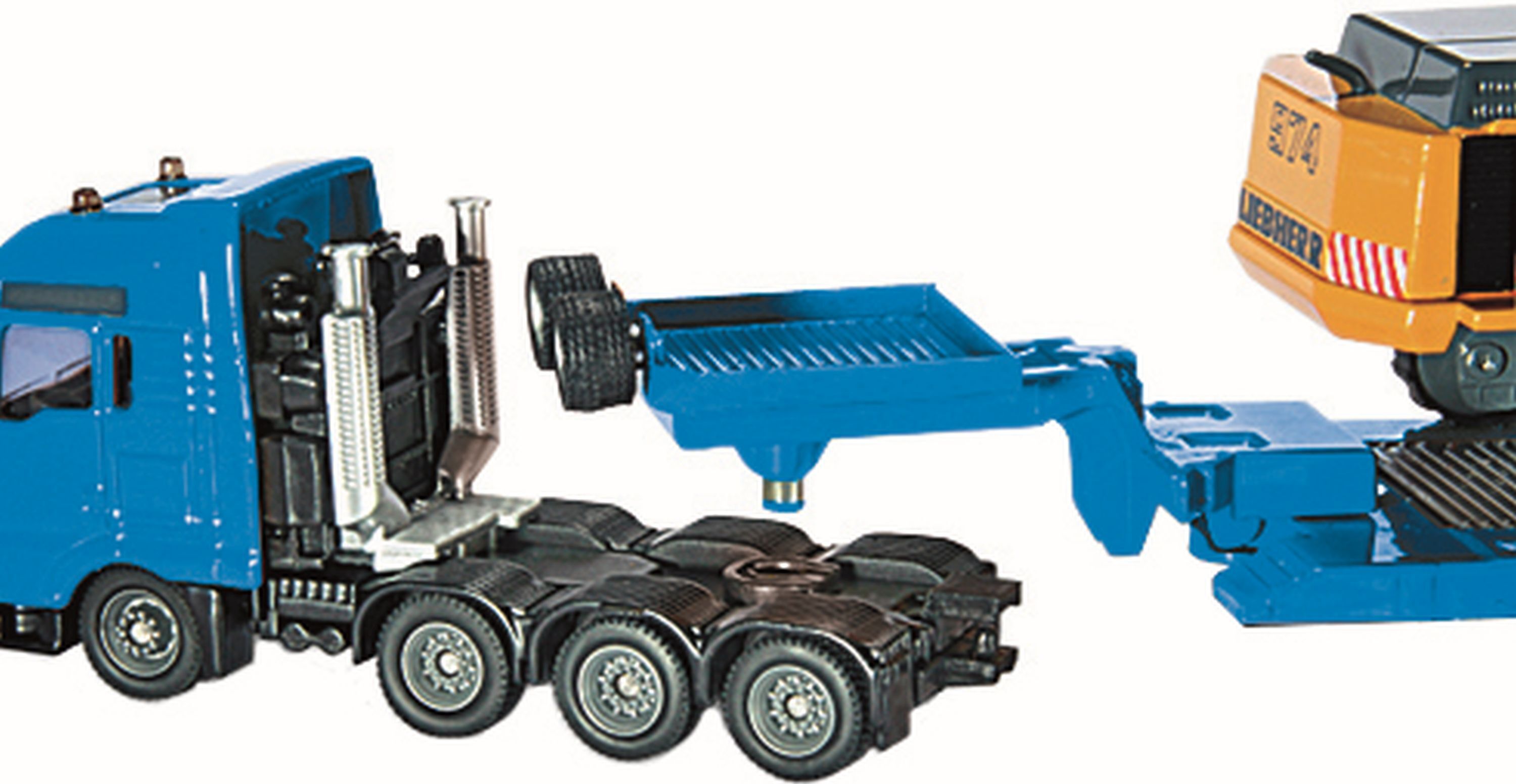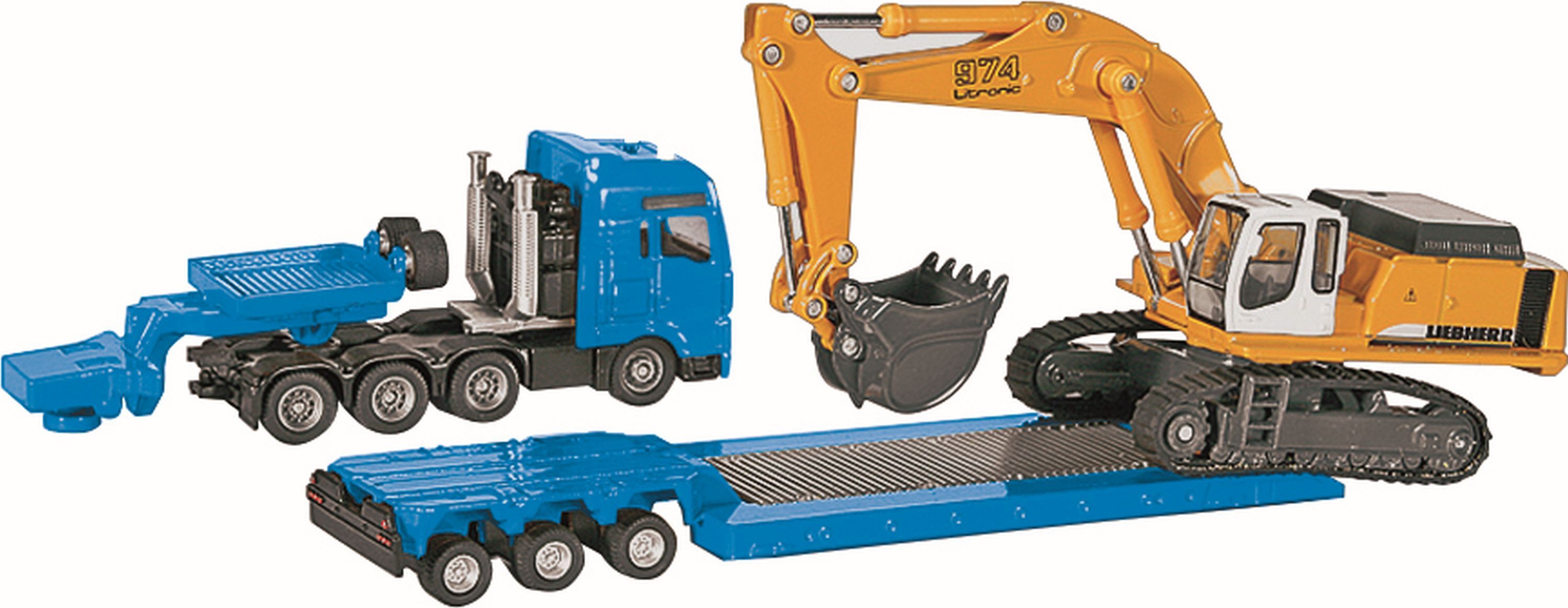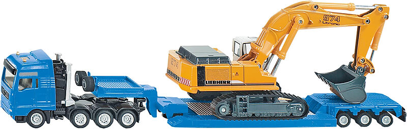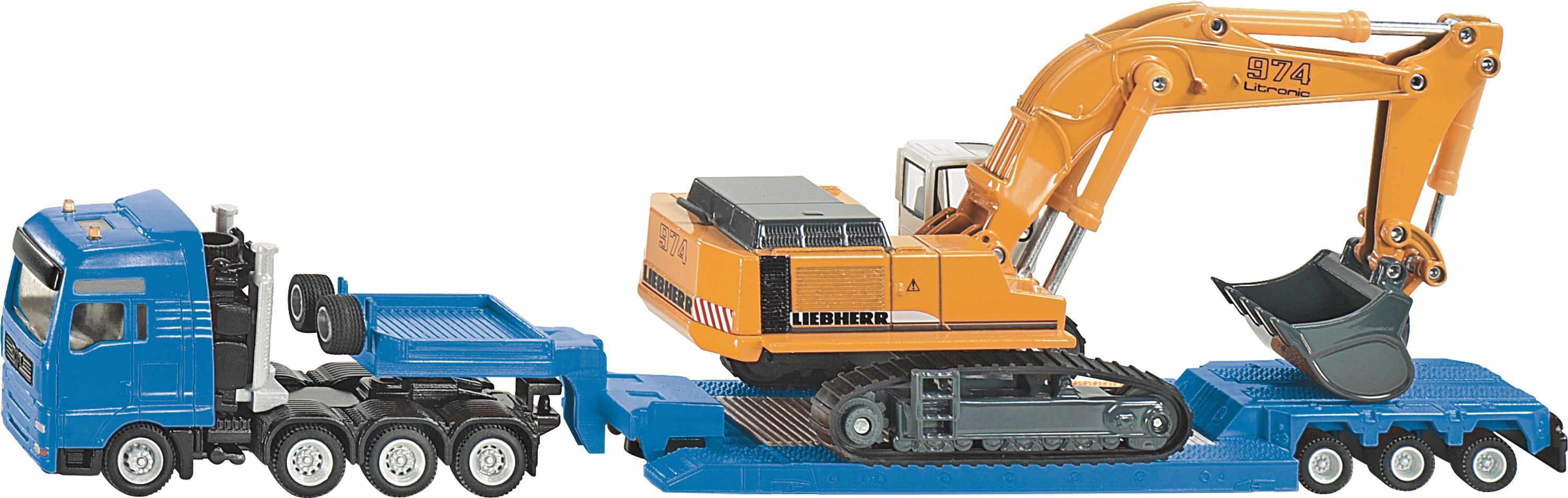 SIKU 1847 Schwertransporter mit Tiefbettauflieger Detailliertes Spielzeugmodell eines Schwertransport mit Tiefbettauflieger und Liebherr Großbagger mit Tieflöffel zum Spielen und Sammeln - Umfangreiche Funktionen: Abkoppelbarer Auflieger, Zugmaschine mit ander...