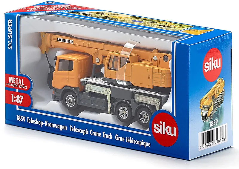 SIKU 1859 Teleskop-Kranwagen 1:87 Originalgetreue Nachbildung eines Liebherr Teleskop-Kranwagen zum Spielen und Kombinieren mit weiteren SIKU Spielzeugen - Umfangreiche Funktionen: Teleskopierbarer Ausleger, ausfahrbare Metallstützen für sicheren Stand, Drehba...