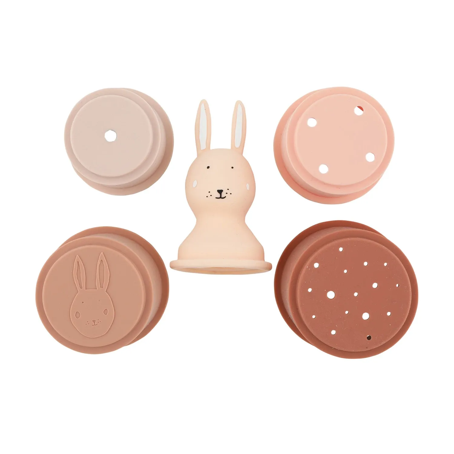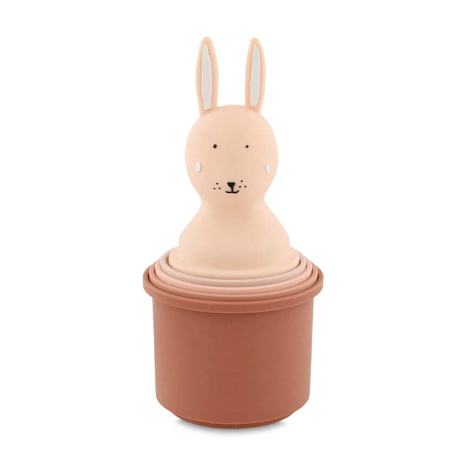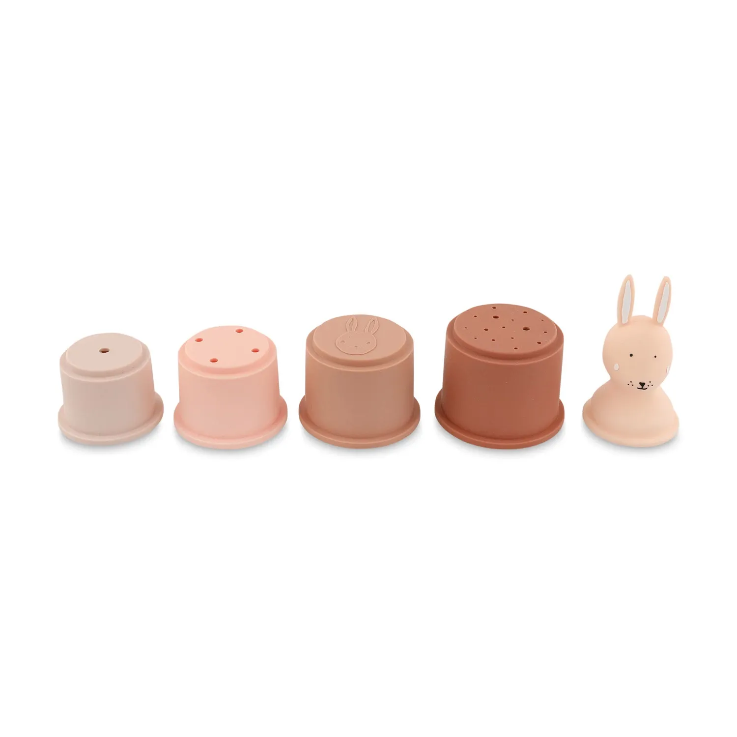 Höher...höher...hoppla! Sie purzeln hinunter. Die stapelbaren Becher aus weichem Silikon haben schöne Farben und eine pfiffige Form. Einige haben Löcher, damit sie unterschiedlich auf dem Wasser treiben, andere lassen sich füllen und ausgiessen. Man kann sie a...