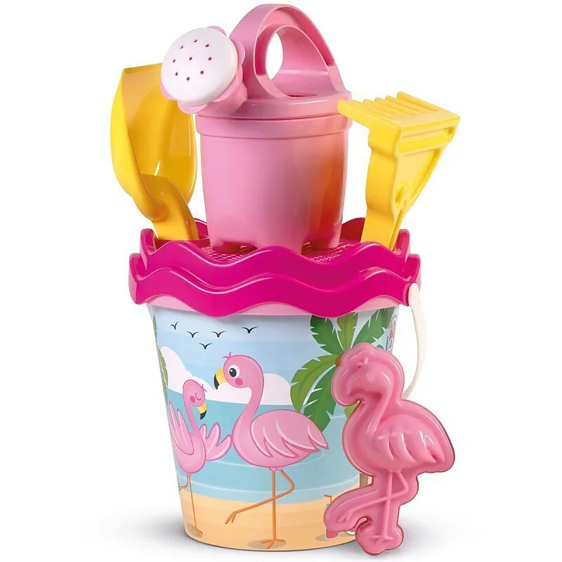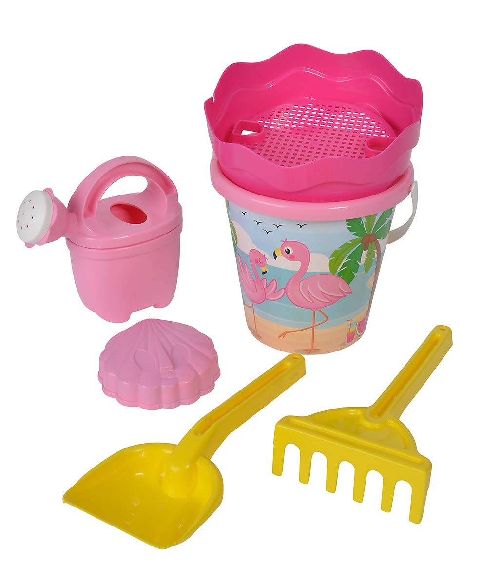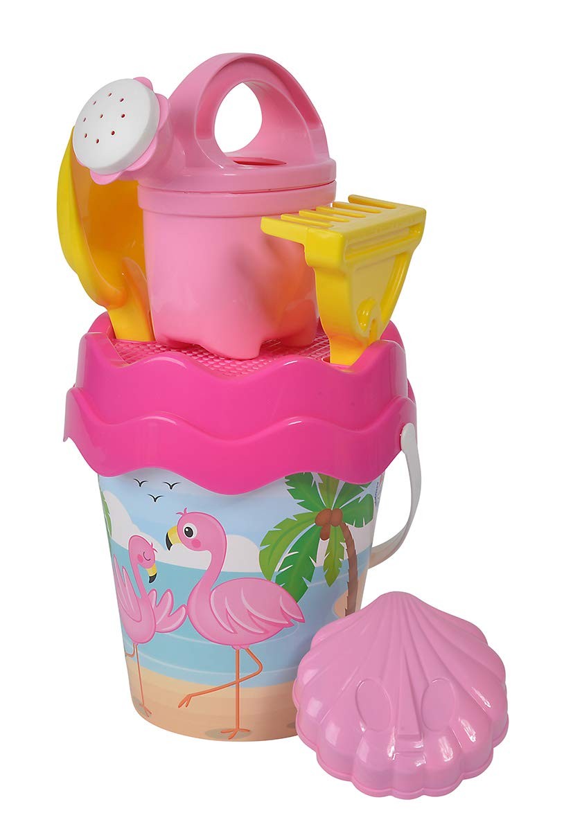 Simba 107114406 - Flamingo Baby-Eimergarnitur / 6-tlg., Eimer, Sieb, Sandform, Schaufel, Rechen, Gießer