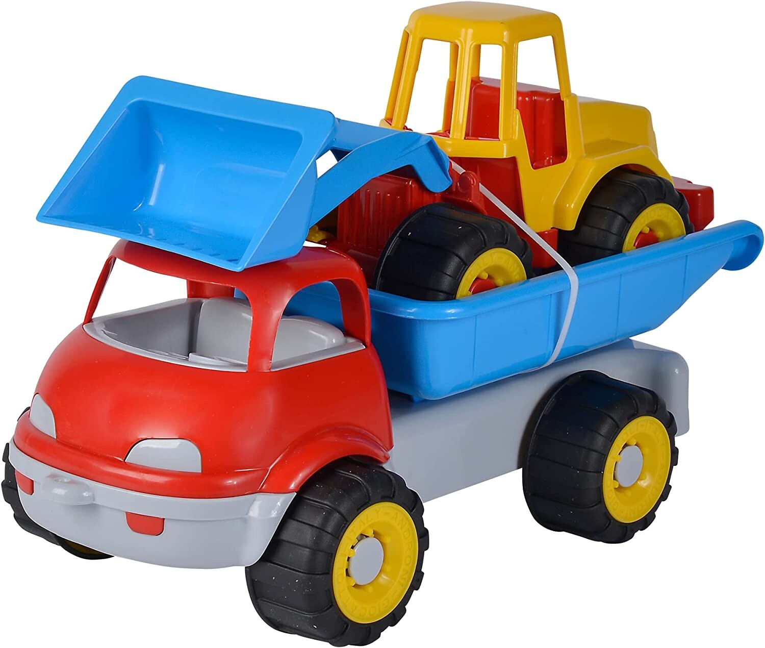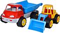 Sandspielzeug - mit dem LKW Kipper und kleinen Bagger kommt keine Langeweile im Sandkasten auf. Kleine Baustellenfans können hier fleißig Sand schaufeln und abtransportieren. Im Set sind zwei Fahrzeuge enthalten. Der LKW Kipper ist 36cm groß, der Bagger ist 29...