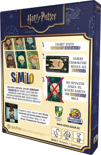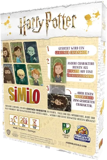 Bei Similo: Harry Potter geht es darum, als Team einen ganz bestimmten Charakter zu finden. Nur ein Spieler weiß, welcher der ausliegenden Charaktere der gesuchte ist. Er legt immer eine Karte als Hinweis auf Gemeinsamkeiten oder Unterschiede. Die Ratenden sch...