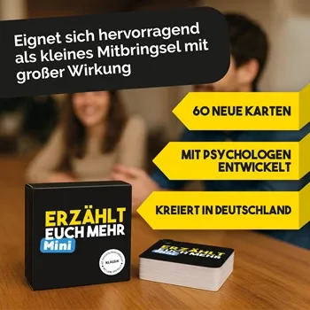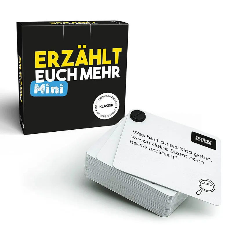 Erzählt euch mehr Klassik ist ein Fragespiel für alle, die sich auf neue oder tiefere Gespräche einlassen möchten. Unabhängig davon, ob ihr euch seit Jahren kennt oder gerade erst begegnet seid. Ob beim Familienessen, im Kollegenkreis, am Lagerfeuer oder auf d...