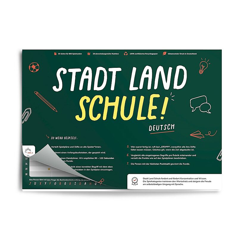 Stadt Land Schule fordert und fördert Konzentration und Wissen. Die Spielkategorien trainieren den Wortschatz und steigern die Freude am selbstständigen Umgang mit Sprache. Enthält: 1x A4 Block mit 50 Blatt.
