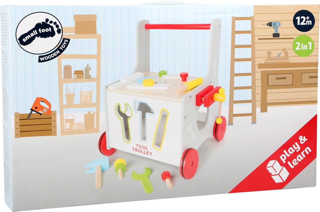 Handwerker aufgepasst! Mit diesem Lauflernwagen und dem zahlreichen Zubehör aus robustem, teilweise lackiertem, Holz ist jede Menge Spielspaß garantiert. Nicht nur das Laufen lernen, auch erste handwerkliche Drehs und Kniffe können mit vielfältigen Spielmöglic...