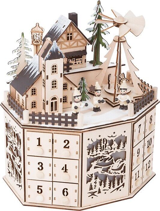 Eine verträumte Weihnachtslandschaft! Dieser detailreich gearbeitete Adventskalender überzeugt mit der wunderschönen Gestaltung der beleuchteten, historischen Häuser und der elektrisch betriebenen Weihnachtspyramide. Vier weihnachtliche Holzschnitte werden dur...