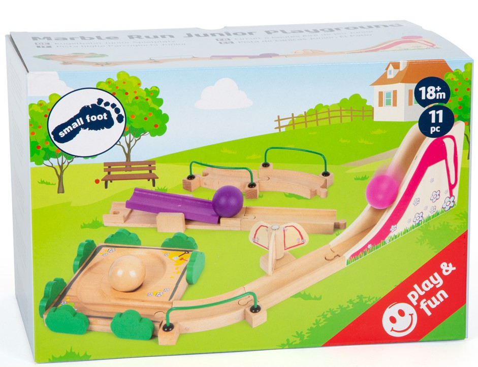 Kullerspaß für jüngste Kugelbahn-Fans! Kinderleicht sind die verschiedenen Bauelemente dieser Junior-Kugelbahn zusammengebaut und schon können die extragroßen, bunten Holzkugeln Fahrt aufnehmen. Passend zum Thema Spielplatz bereichern Rutsche, Drehmühle, Wippe...