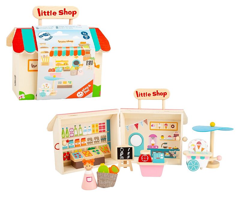 Komm, wir gehen einkaufen! Dieser kompakte Kaufmannsladen im handlichen Holzkoffer ist durch einen kindgerechten Verschluss aus Holz gesichert und verstaut Eisstand, Sonnenschirm, zahlreiche Obst- und Gemüsesorten, Kasse, Waage, Angebotstafel sowie eine Verkäu...