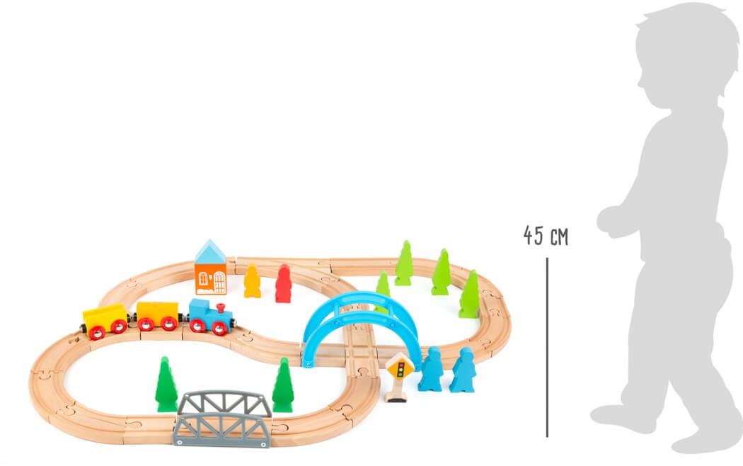 Eine Eisenbahnwelt für kleine Entdecker! Mit diesem Eisenbahn-Set aus Holz inkl. umfangreichem Zubehör-Set kommen kleine Eisenbahner voll auf ihre Kosten. Hier fährt die Eisenbahn über Brücken und durch Täler und schlägt durch die verschiedenen Gleisabzweigung...