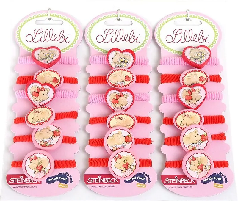 3 Sets 6 Zopfgummis. Der kleine Mäusejunge Lillebi ziert mit seiner Freundin Kikibell diese tollen Zopfgummis aus sehr weichem Frottee. Verschiedene Formen aus Holz zieren die elastischen Zopfgummis und erfreuen jeden Lillebi-Fan aus der Steinbeck-Familie. Ein...