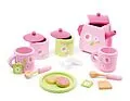 Eine Augenweide für den Five oclock Tea am Kindertisch: Das hübsche Teeservice ist in Zartrosa und Pastellgrün lackiert und lädt ein zu einem stilvollen Heißgetränk. Zwei Löffel, Teebeutel und Zuckerwürfel sowie ein Teller mit Keksen vervollständigen das Servi...